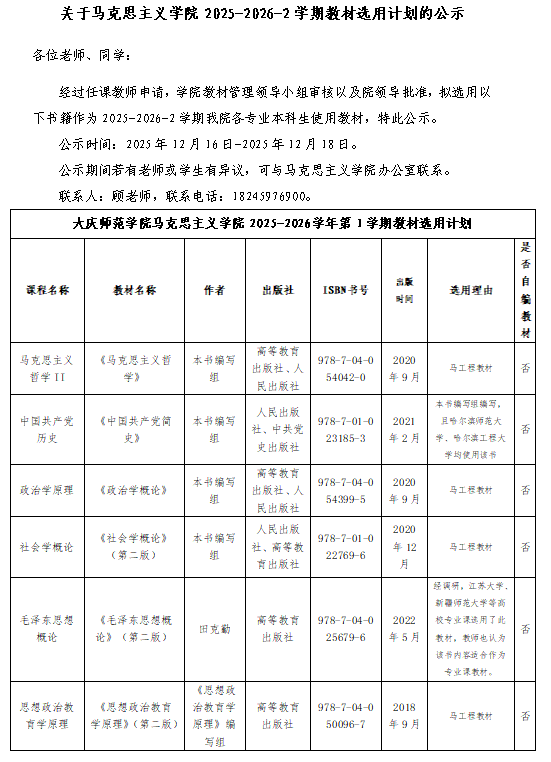 关于马克思主义学院2025-2026-2学期教材选用计划的公示