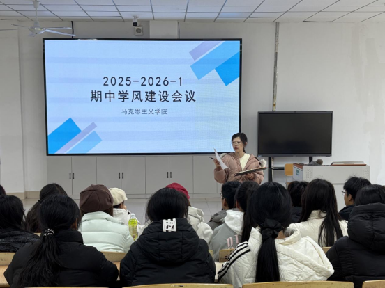 为总结开学一个半月以来的学风情况、明确后续学习方向,2025年10月28日,马克思主义学院组织2025级学生召开2025-2026学年第一学期期中学风建设大会,会议由辅导员汪丽媛主持。